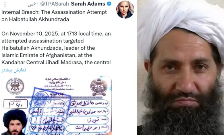 راه مدنیت: به گزارش سارا آدامز که در حساب رسمی وی در شبکه اجتماعی ایکس منتشر شده، حوالی ساعت ۱۷:۱۳ تاریخ ۱۰ نوامبر ۲۰۲۵ در جریان برنامهای در مدرسۀ جهادی مرکزی قندهار، تلاش کمسابقهای برای ترور رهبر طالبان صورت گرفته است. مهاجم حافظ صدیقالله، فرزند مولوی عبدالنبی و باشنده ولسوالی موسیقلعه ولایت هلمند معرفی شده است.