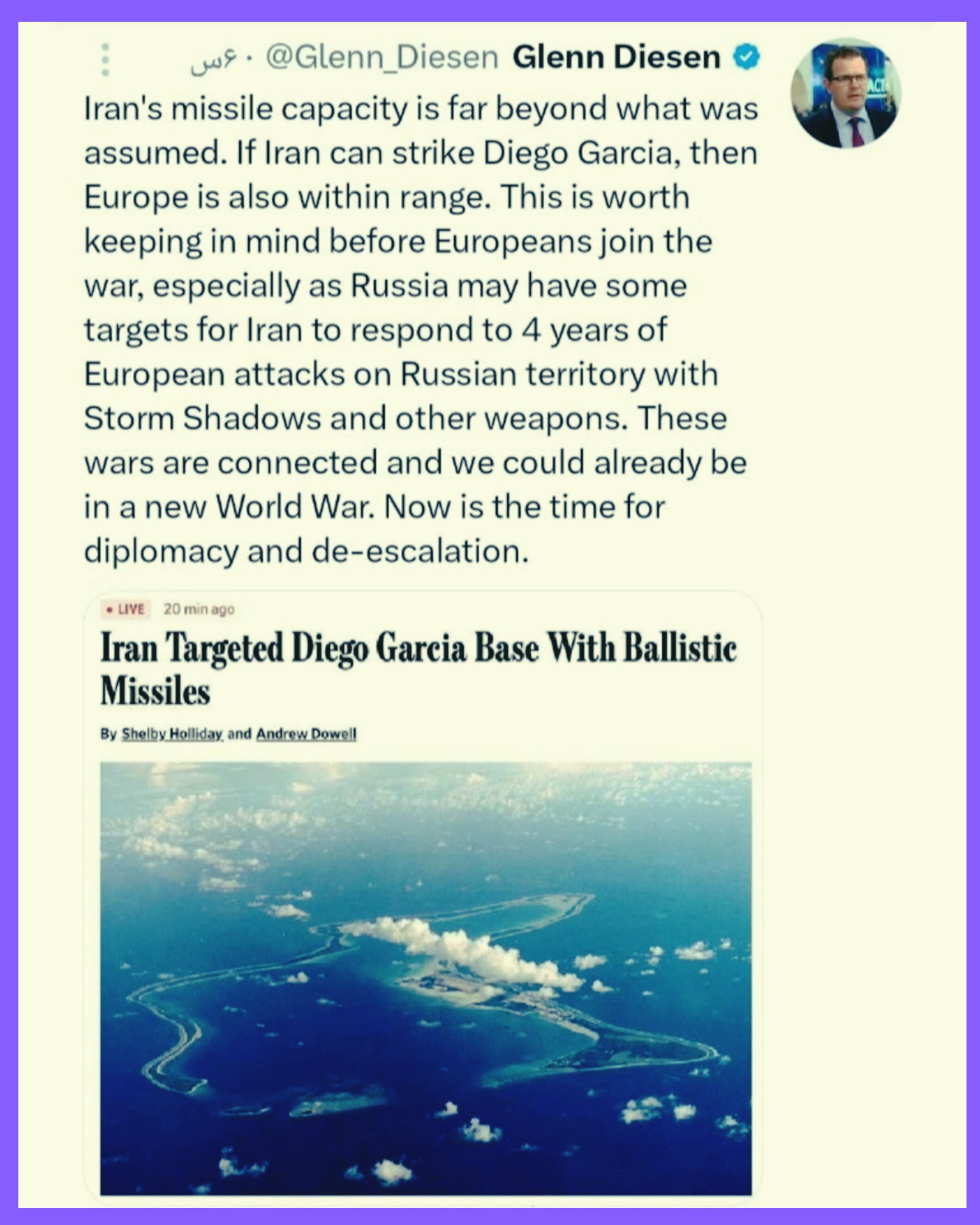 راه مدنیت: *گلن دیزن؛ استاد روابط بینالملل و تحلیلگر برجسته ژیوپلیتیک در یادداشتی تازه که در صفحه ایکس خود منتشر کرده، نسبت به توانمندیهای موشکی ایران و پیامدهای آن برای امنیت اروپا هشدار داده است.