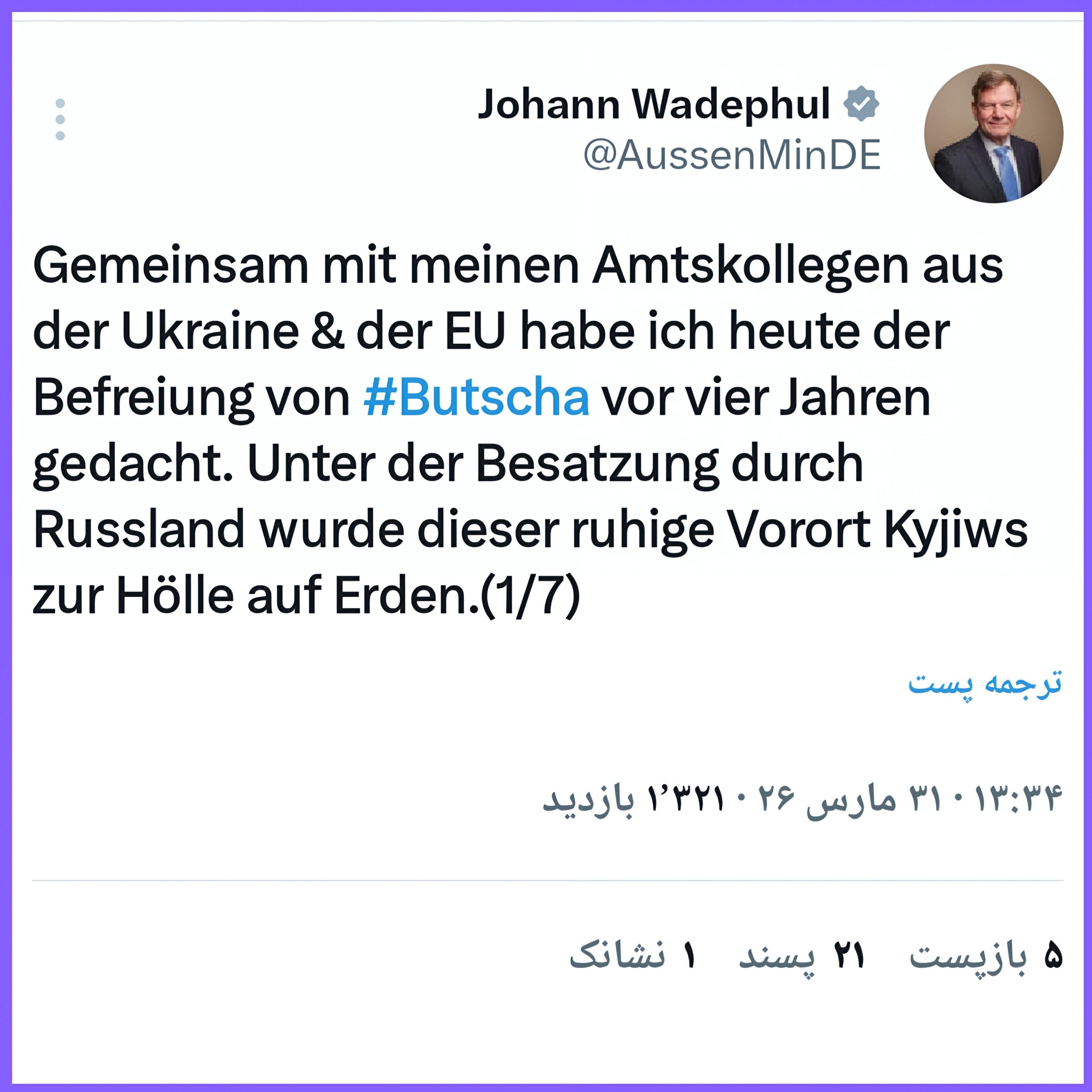 راه مدنیت: در چهارمین سالگرد آزادی شهر بوچا، یوهان واده‌فول؛ وزیر خارجه آلمان در پیامی در شبکهٔ اجتماعی رسمی خود X، این شهر را نماد «جنایات هدفمند علیه غیرنظامیان» در جنگ روسیه علیه اوکراین خوانده و بر تداوم حمایت برلین از کی‌یف تاکید کرده است.