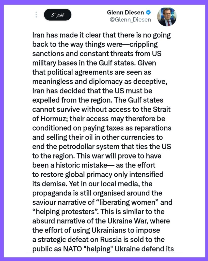 در این میان، *گلن دیزن (Glenn Diesen)؛ تحلیلگر نامآشنای روابط بینالملل در یادداشتی تاملبرانگیز، سیاستهای استراتژیک ایالات متحده را به چالش کشیده و روایتهای رسمی غرب را زیر سوال برده است.